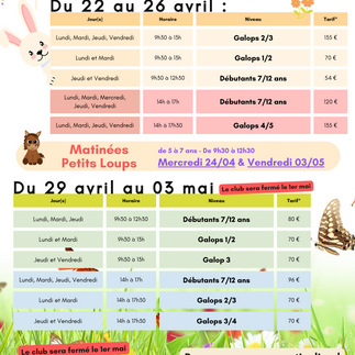 𝗦𝘁𝗮𝗴𝗲𝘀 𝗩𝗮𝗰𝗮𝗻𝗰𝗲𝘀 𝗱𝗲 𝗣𝗿𝗶𝗻𝘁𝗲𝗺𝗽𝘀 ☀Inès Perraud28 mars 20241 min de lectureLe planning des stages est en ligne 🐎N'hésitez pas à contacter Hélène pour tous renseignements📲 06 80 14 33 50📅 Info : Le Club sera fermé le 1er mai#vacancesscolaires #stagesequitationhttps://www.facebook.com/share/p/Pn4VcFRfnt9x7iSx/?mibextid=WC7FNe
